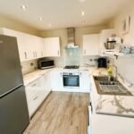 Step inside to a stylish breakfast kitchen, finished in a sleek modern design with high-quality units and integrated hob and oven — the perfect space for everyday dining and entertaining. To the rear, a bright and airy lounge features wood-effect flooring and double French doors opening onto the private rear garden, seamlessly blending indoor and outdoor living.