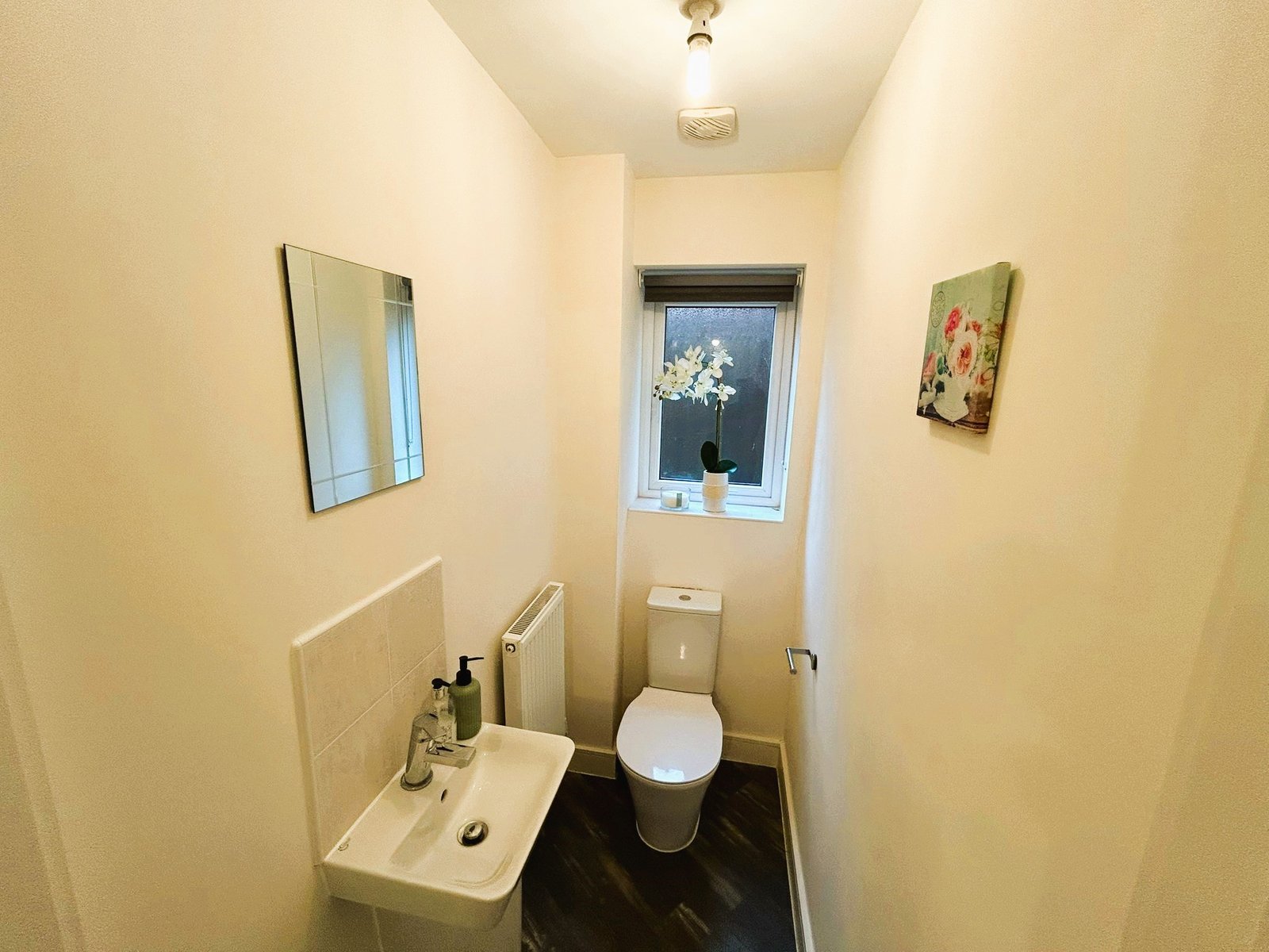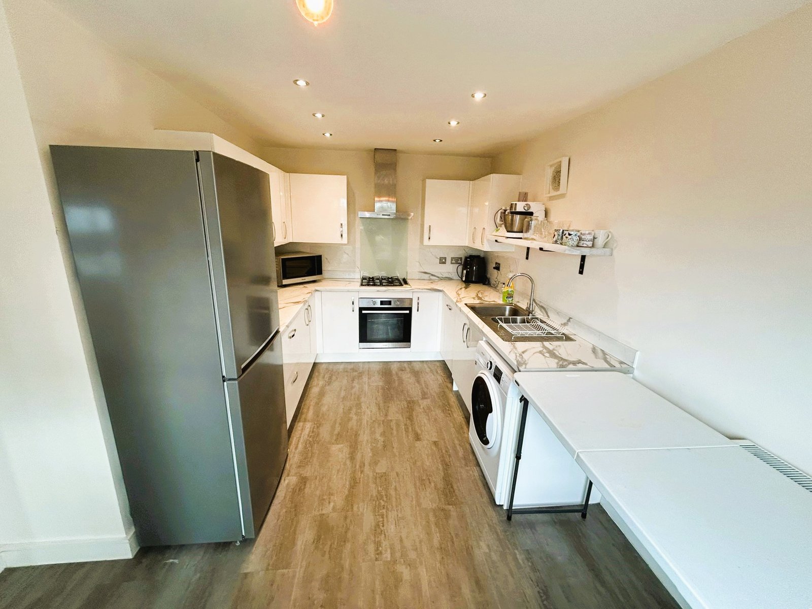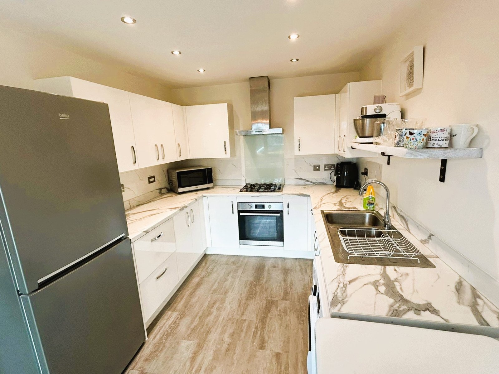 Step inside to a stylish breakfast kitchen, finished in a sleek modern design with high-quality units and integrated hob and oven — the perfect space for everyday dining and entertaining. To the rear, a bright and airy lounge features wood-effect flooring and double French doors opening onto the private rear garden, seamlessly blending indoor and outdoor living.